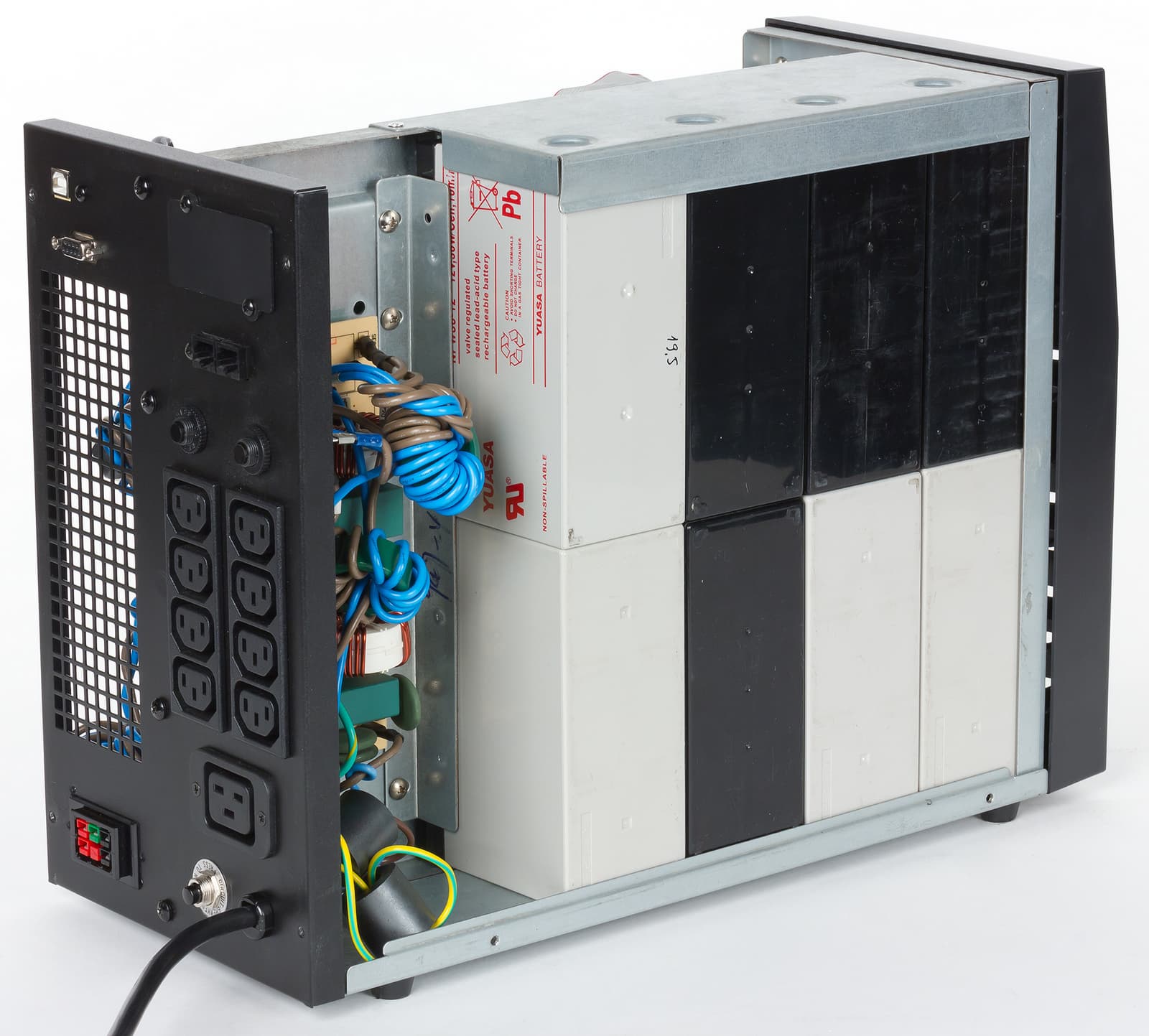 Внутри корпус состоит из двух частей, разделенных металлической перегородкой. С одной стороны находится батарейный блок, а с другой — вся необходимая электроника. Нельзя обойти вниманием тот факт, что для удешевления производства модели ИБП этой серии не оборудованы специальным отсеком для батарей и возможностью горячей замены.