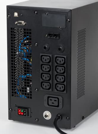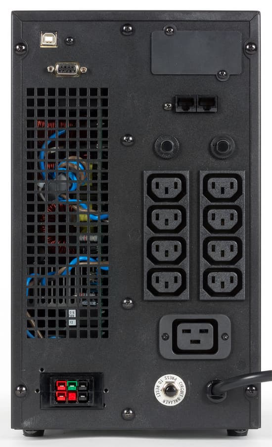 На задней панели имеется восемь розеток стандарта IEC C13 и одна розетка IEC 19. Как такового разделения на группы здесь нет, хотя для каждой из групп (по 4 розетки IEC C13) существует отдельная кнопка сброса. Наличие нестандартного для пользовательских устройств разъема IEC 19 относит этот ИБП к классу серверных источников. Помимо выходных розеток, на задней панели присутствует интерфейс USB для подключения к ПК, порт RS-232, два разъема RJ-45 (In и Out) и прерыватель. Нельзя не отметить, что Powercom Macan MAS-3000 подключается к силовой сети посредством несъемного шнура с разъемом IEC 19. Это достаточно необычно, и скорее всего, такая нестандартность опять-таки объясняется тем, что мы получили на тест предпродажный семпл — ведь предлагаемая в рознице эта модель имеет стандартную вилку для подключения к сети. В нашем случае в комплекте с устройством шел удлинитель для подключения к «нормальной» розетке.