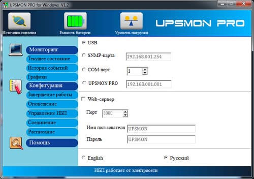 Первоначальная настройка сводится к указанию IP-адреса ИБП, к которому будет подключаться утилита. Для вывода ИБП в сеть необходимо или установить SNMP-модуль в соответствующий слот источника, или же установить программу UPSMon Pro на компьютере. В последнем случае подключение необходимо устанавливать с IP-адресом компьютера, на котором это приложение установлено.