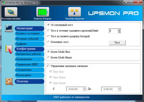 При отключении внешнего напряжения появляется предупреждающее окно (оно появляется каждую секунду, даже если его закрыть). Сценарий отключения (выключение ПК, завершение по заряду батарей, выполнение программы и т. д.) также можно запрограммировать заранее. Поддерживается отправка почтовых оповещений на указанный адрес, а также ведение логов и создание графиков по указанным параметрам (напряжение, нагрузка, емкость батареи). Нельзя сказать, что интерфейс удобен, но все базовые возможности по управлению он предоставляет.