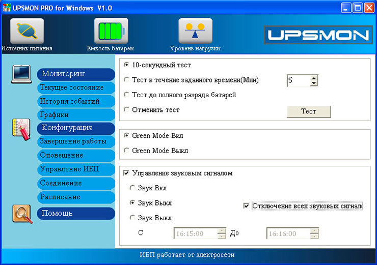Программное обеспечение UPSMon отображает текущий статус источника бесперебойного питания, включая состояние сети, батарей и нагрузки, а также оценивает возможное время автономной работы, ведет журналы состояния сети питания и событий ИБП, позволяет гибко настроить сервис безопасного отключения питания клиентов и самого ИБП при снижении уровня заряда батарей, поддерживает отправку уведомлений администратору по электронной почте. Кроме того, с его помощью вы можете провести тест работы от батарей, выбрать режим звуковой сигнализации, управлять питанием нагрузки (если это предусмотрено моделью ИБП).