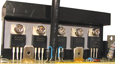 Каждый транзистор имеет мощность 200 Вт и диапазон рабочих температур до 175° Цельсия. При работе на нагрузку в 80% от максимальной, температура транзисторов составила 53°, а обмоток трансформатора 71 ° Цельсия.