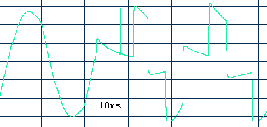 Инвертер на четырех транзисторах IRF-3205 формирует двухступенчатую аппроксимацию синуса. Вид и качество формируемого сигнала хорошо видно на осциллограмме. Мощность, потребляемая инвертором при работе от батареи, без внешней нагрузки составляет 13 Вт.