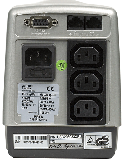 В верхней чести интерфейсный разъем RS-232с для связи с компьютером или управляющим устройством, и два разъема RJ-45 которые позволяют подключить телефон через ИБП.