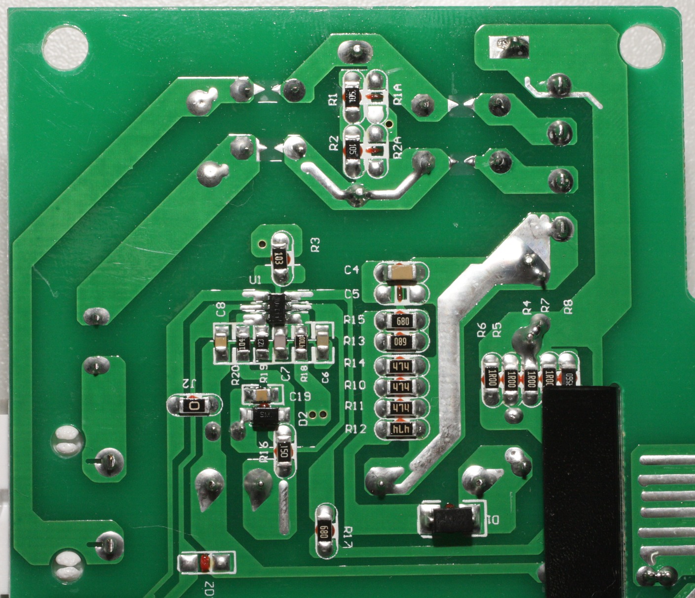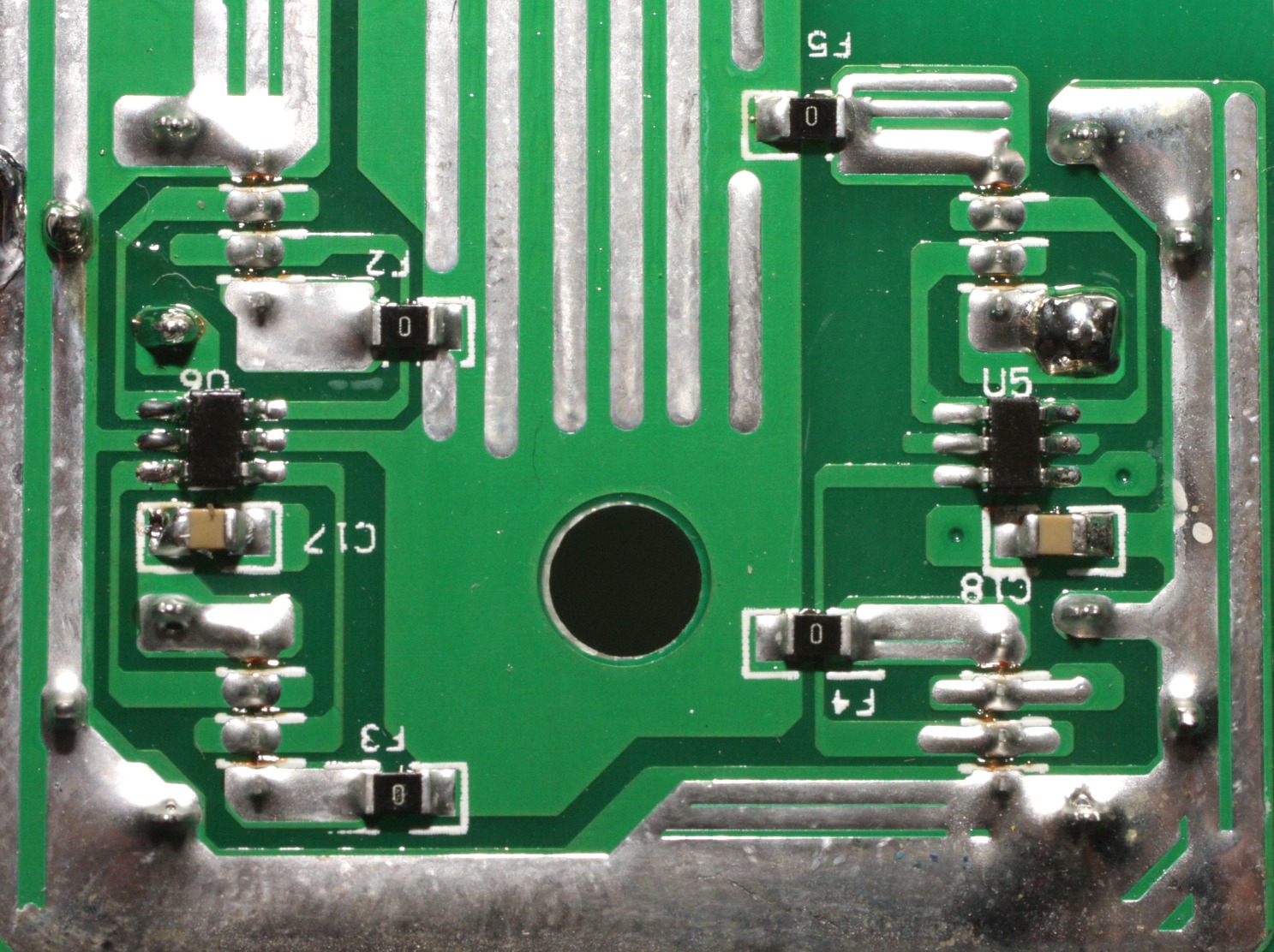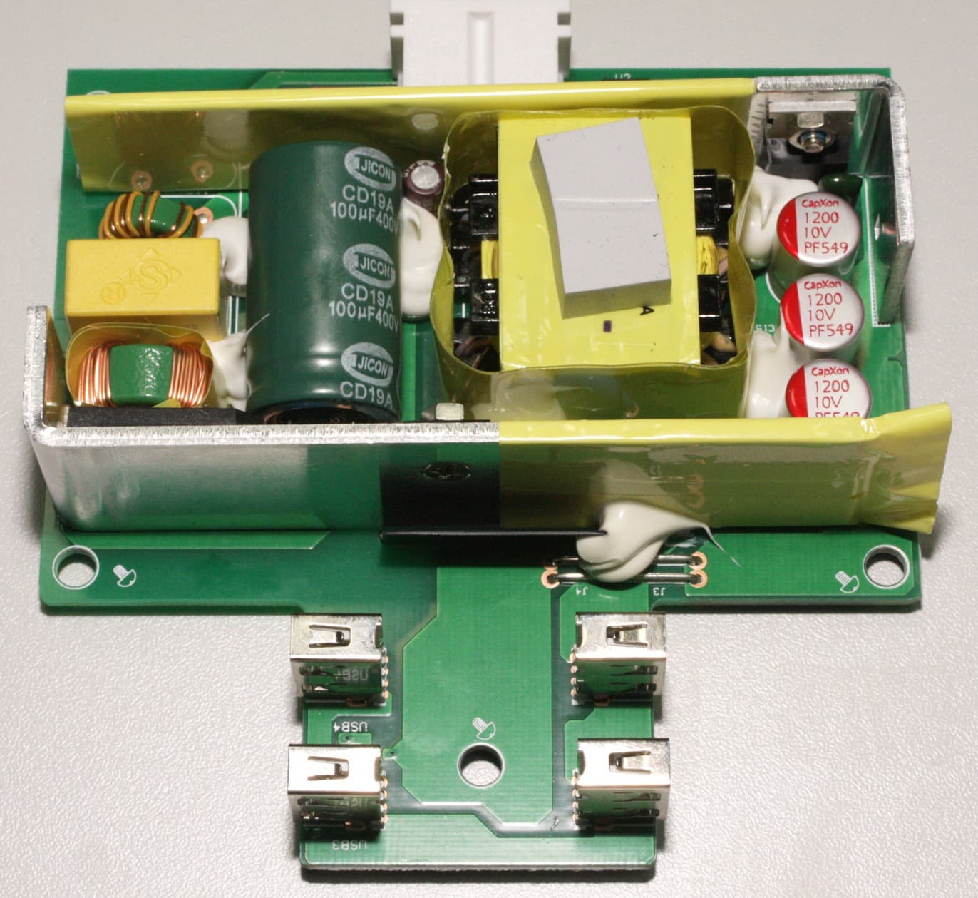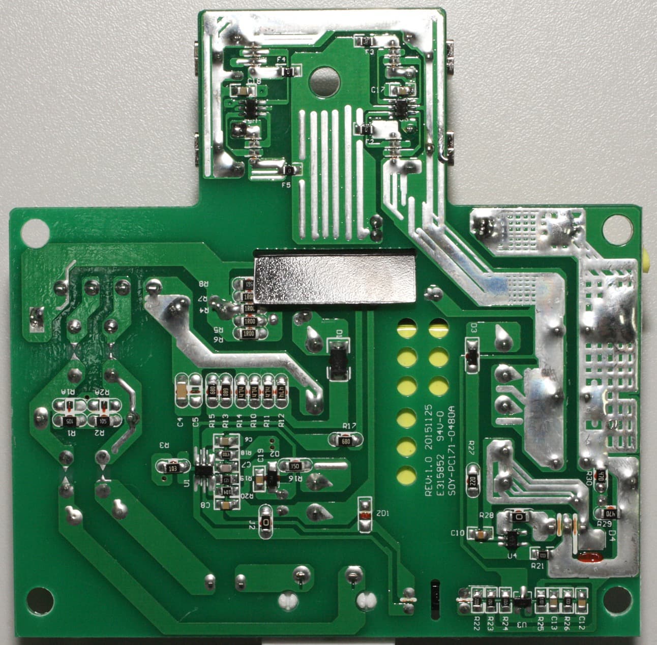 На плате есть отверстия для лучшего охлаждения трансформатора, также между ним и кожухом установлена теплопроводящая прокладка. При этом в кожухе, как и во внешнем корпусе зарядки, вентиляционные отверстия отсутствуют. В низковольтной части все четыре USB-разъема сидят на одной отрицательной шине, но к положительной они подключены через резисторы поверхностного монтажа типоразмера 0805 с условным сопротивлением в 0 Ом. Эти резисторы служат своеобразными предохранителями, так как их сопротивление все же не нулевое и на очень больших токах они выгорают. Однако фактически защиты от превышения допустимой нагрузки на порт нет. Защита, наверняка реализованная в ШИМ-контроллере, сработает только при значительном превышении суммарной допустимой мощности на выходе источника. За «умные» функции зарядки отвечают две микросхемы (к сожалению, их маркировку мы не разобрали), размещенные рядом с портами USB. В их задачу входит коммутация линий «плюс», «минус» , D+ и D− (в том числе и через сопротивления нужного номинала) порта USB таким способом, чтобы подключенное устройство распознало совместимую зарядку и смогло увеличить потребляемый ток.