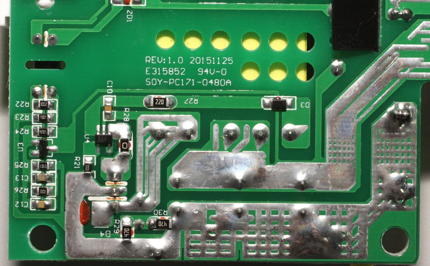 В низковольтной части используются конденсаторы более-менее внушающей доверие марки CapXon (не лучший, но и не худший вариант) — видимо, твердотельные, а значит, с увеличенным сроком службы. Отметим, что выход из строя накопительных конденсаторов в низковольтной части является самой распространенной причиной отказа импульсных источников питания. И да, схемотехнически Zentree — это обратноходовой импульсный источник питания. Низковольтная часть основана на прогрессивной схеме, так как вместо традиционного диода применяется схема с синхронным выпрямителем с управляющей схемой и силовым полевым транзистором. В открытом состоянии этот транзистор имеет очень низкое сопротивление, что в сравнении со схемой на диоде увеличивает эффективность и, соответственно, снижает выделение тепла.