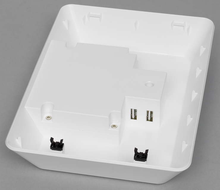 Внутри мы видим четыре USB-порта (два ориентированы в одну сторону, два — в другую). В эти порты надо вставить кабели таким образом, чтобы после надевания крышки назад провода проходили через две прорези в крышке.