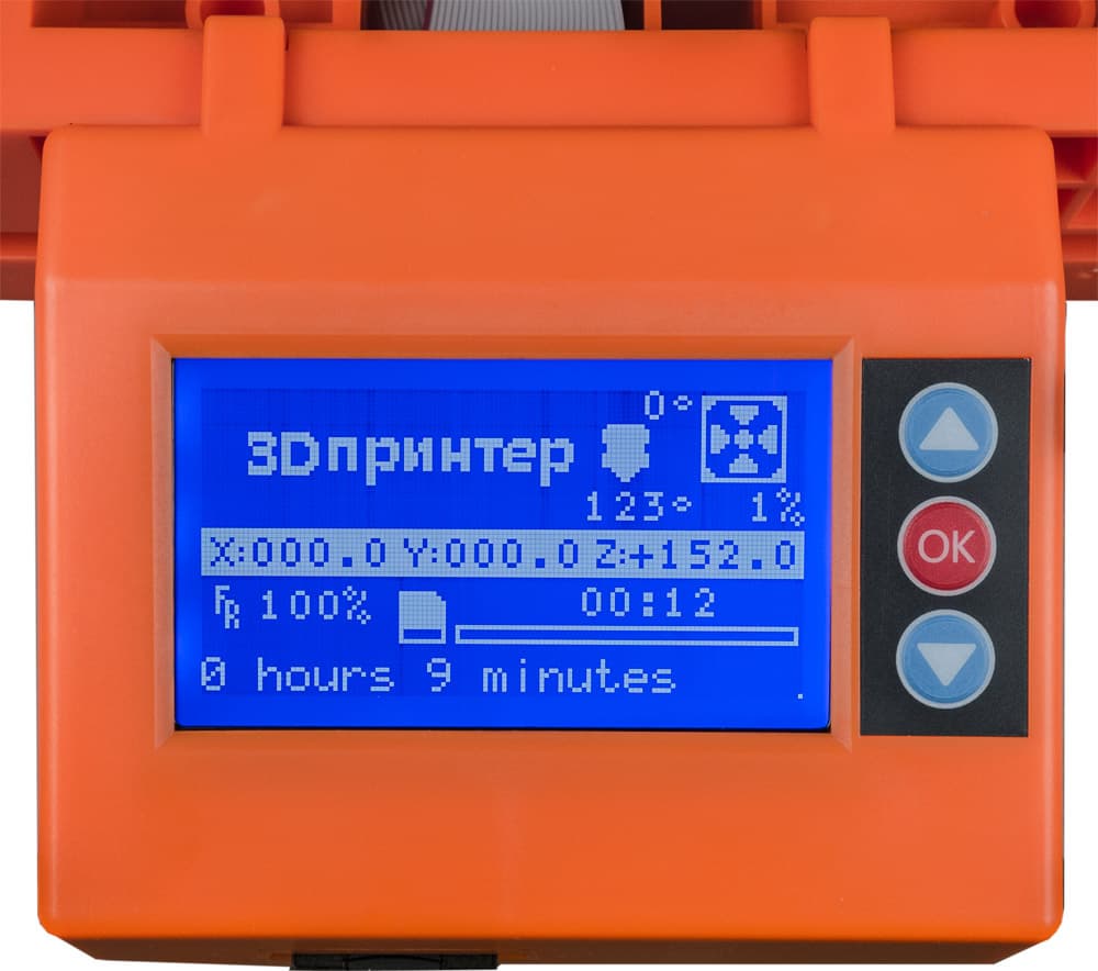 Теперь можно попробовать распечатать любой из двух имеющихся на SD-карте тестовых файлов в формате gcode — уже знакомые нам тест калибровки платформы Bed Leveling wizard или 20-миллиметровый брусок 20mm_Calibration_Box.
