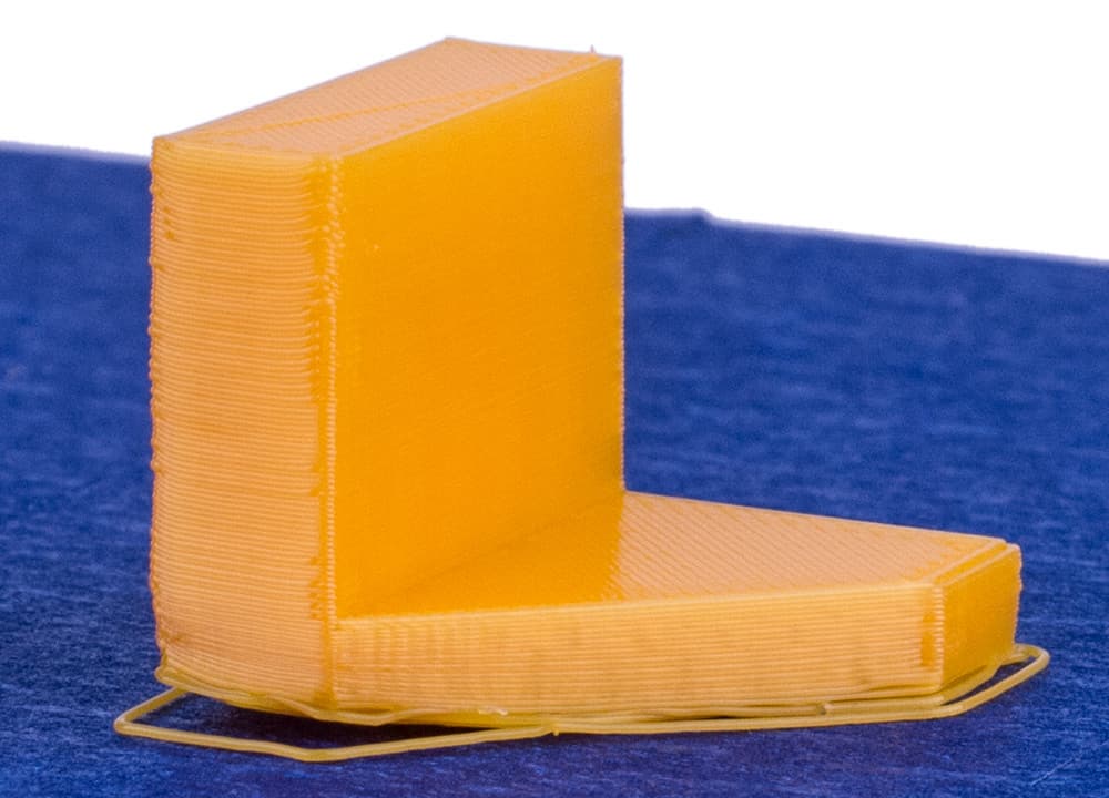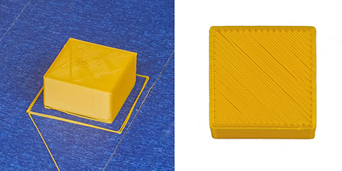 Но это не самая большая проблема: высота бруска составляет всего 10 мм при относительно большой площади основания, а для более высоких образцов, имеющих небольшое пятно контакта со столом, поперечное усилие, создаваемое при перемещении сопла за счет вязкости расплавленного пластика, с учетом большего «плеча» при увеличении высоты наверняка попросту оторвет модель от платформы.