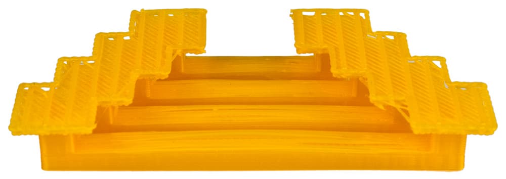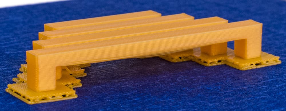 Но адгезия PLA к каптону на неподогреваемом столе оказалась ничуть не лучше, чем к акрилу, и хуже, чем к синему скотчу: мы хотели опробовать печать мостов — четырех образцов разной длины со свободно подвешенной частью. Но основание модели уже на втором слое отваливалось от платформы, причем вместе с каймой, пришлось вернуться к синему скотчу и выбрать другой способ улучшения прилипания первого слоя: сначала печатается состоящее из нескольких слоев по высоте основание, в 3D-печати называемое «плот» (raft), и первый слой самой модели будет прилегать уже не к платформе, а к этому плоту. Естественно, по окончании печати плот придется аккуратно удалить, на что времени и усилий потребуется побольше, чем на удаление каймы.