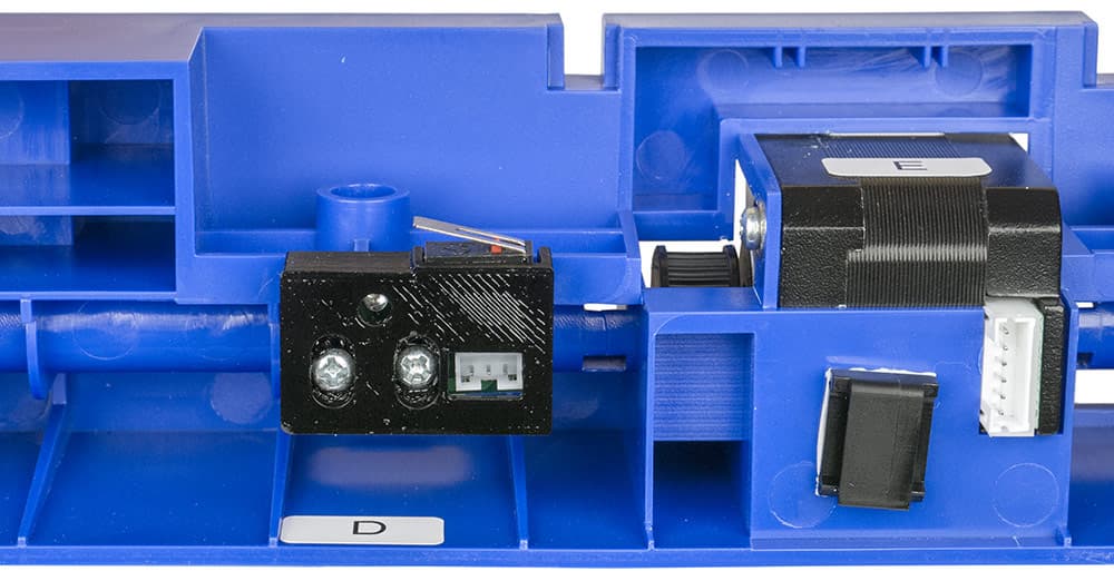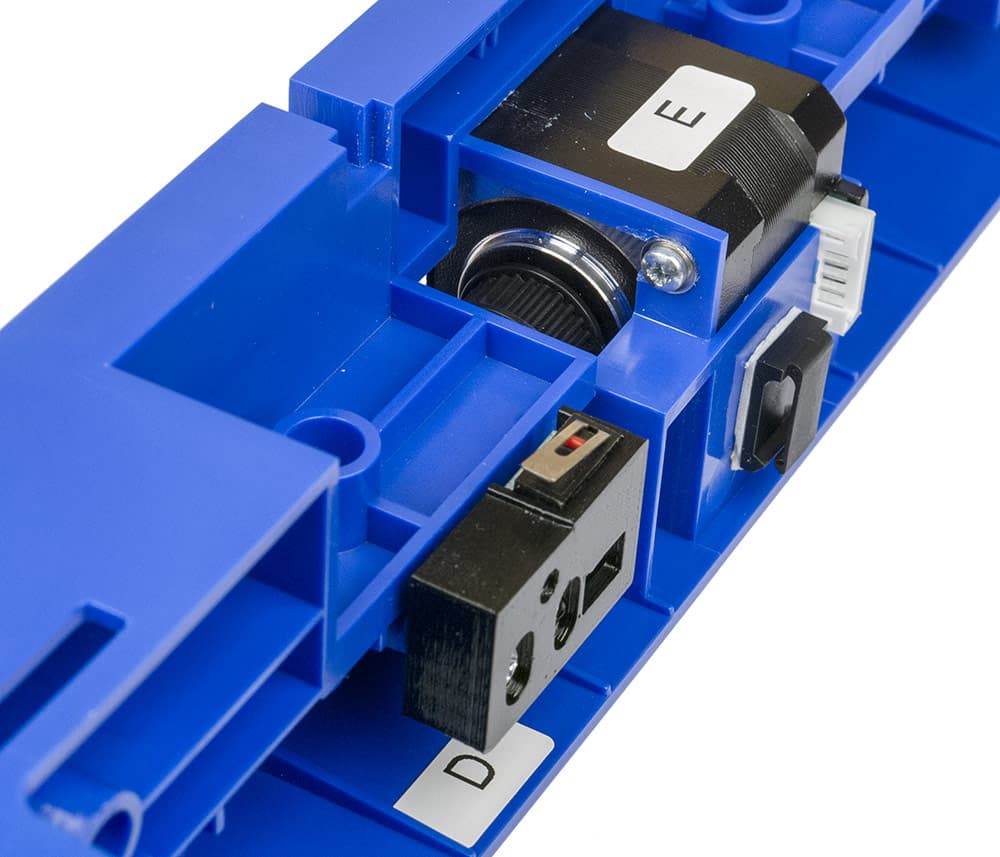 Попутно отметим: имеющиеся наклейки — «E» на двигателе и «D» возле платки — не имеют отношения к тем же буквам в инструкции, в которой они обозначают совсем другие элементы. Указанные наклейки связаны с коннекторами шлейфа, к этому мы вернемся в свое время.