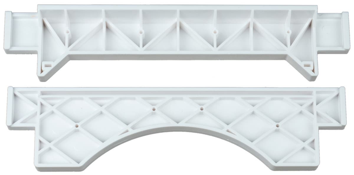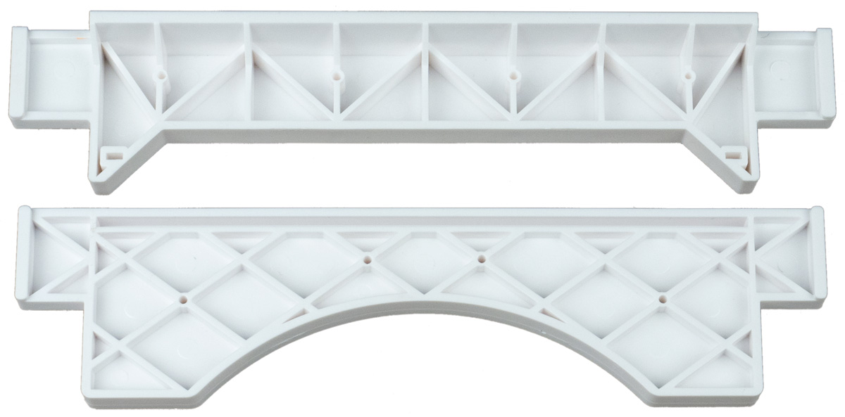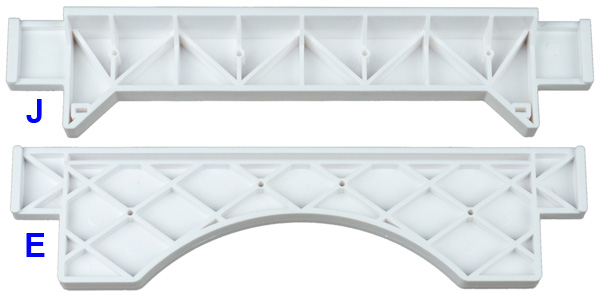 Обратите внимание: белых боковин два вида — горизонтальные E имеют округлый вырез на внутренней кромке, а у вертикальных J вырез в форме трапеции, и эти опоры взаимозаменяемы только внутри вида — детали J на место E не встанут.