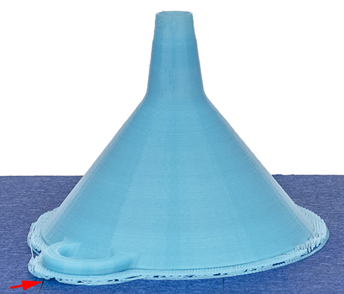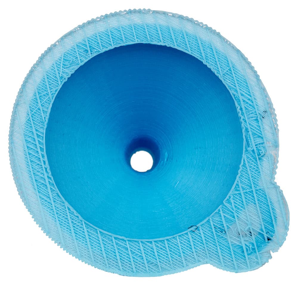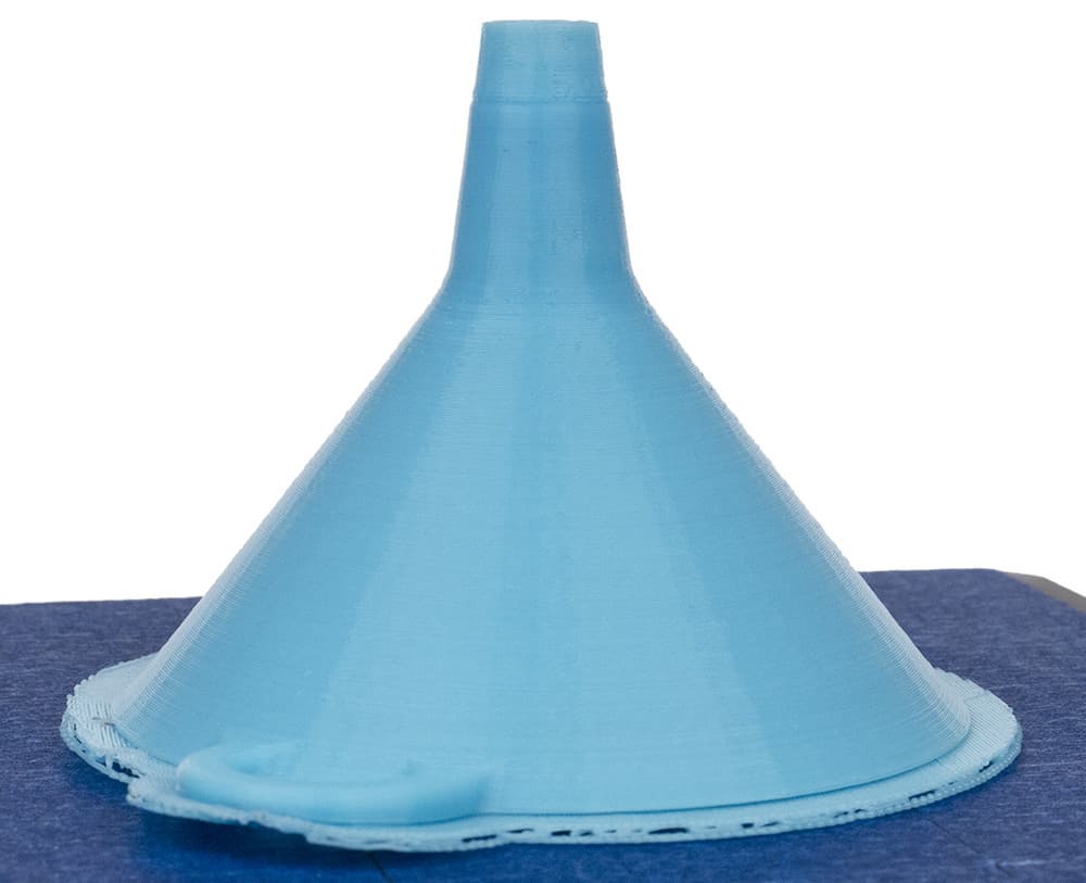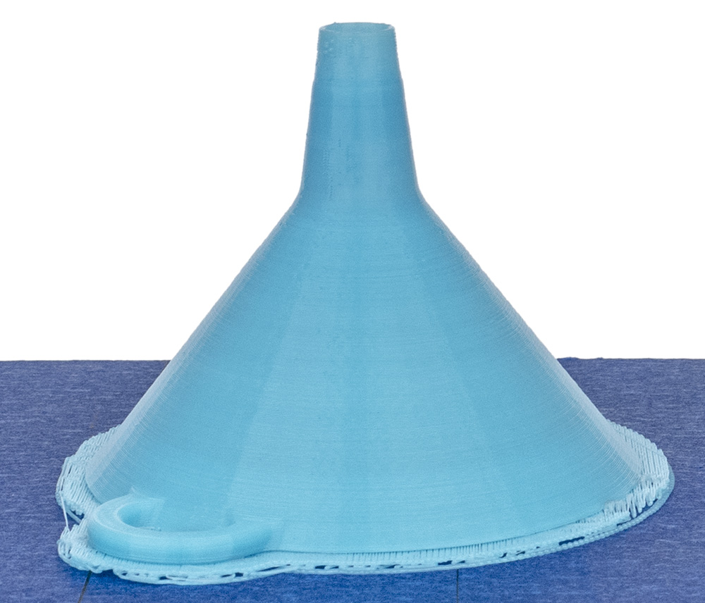 Проверяем печать стенок с умеренным наклоном на примере уже известной нам по тестам других 3D-принтеров воронки, используя PLA голубого цвета. Деталь хоть и крупная, но площадь её основания мала, поэтому задаем печать на подложке.