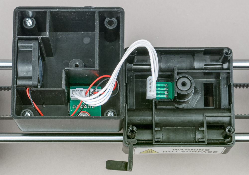 Еще одно наблюдение: шаговые двигатели, все четыре, сильно нагреваются, причем даже не во время печати, а просто при включенном питании. Наш контактный термометр показывал температуры до 45–47 °C — не обжигает, но уже довольно горячо.