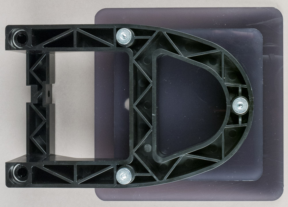 Способы крепления держателя катушки с пластиком в двух моделях немного отличались, причем вариант в синем принтере явно был переделан из держателя оранжевого путем удаления одних крепежных элементов и приклеивания других. Но главное в другом: фиксация обоих держателей на детали А4 не была «железобетонной», имел место солидный люфт, поэтому установка полной килограммовой катушки вызывала заметный наклон, из-за которого заправленная нить порой задевала за боковины катушки и притормаживалась.