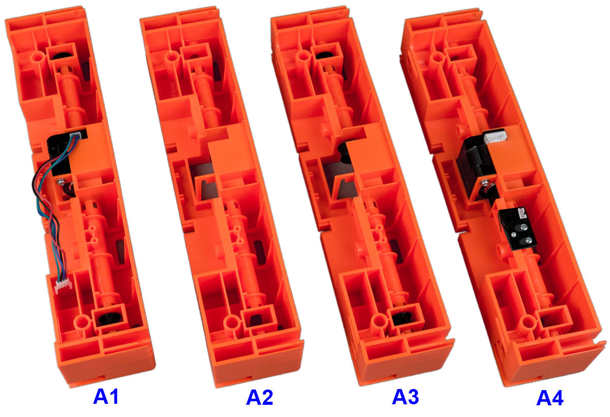 Берем деталь А4 («Lower Rear», с двигателем и закрытой пластиковой крышечкой платкой, на которой расположены микровыключатель и светодиод), располагаем ее платкой к себе и вставляем в верхние отверстия металлические оси: короткие С2 в крайние, длинные С1 в средние. Если присмотреться, именно так делается на видео.