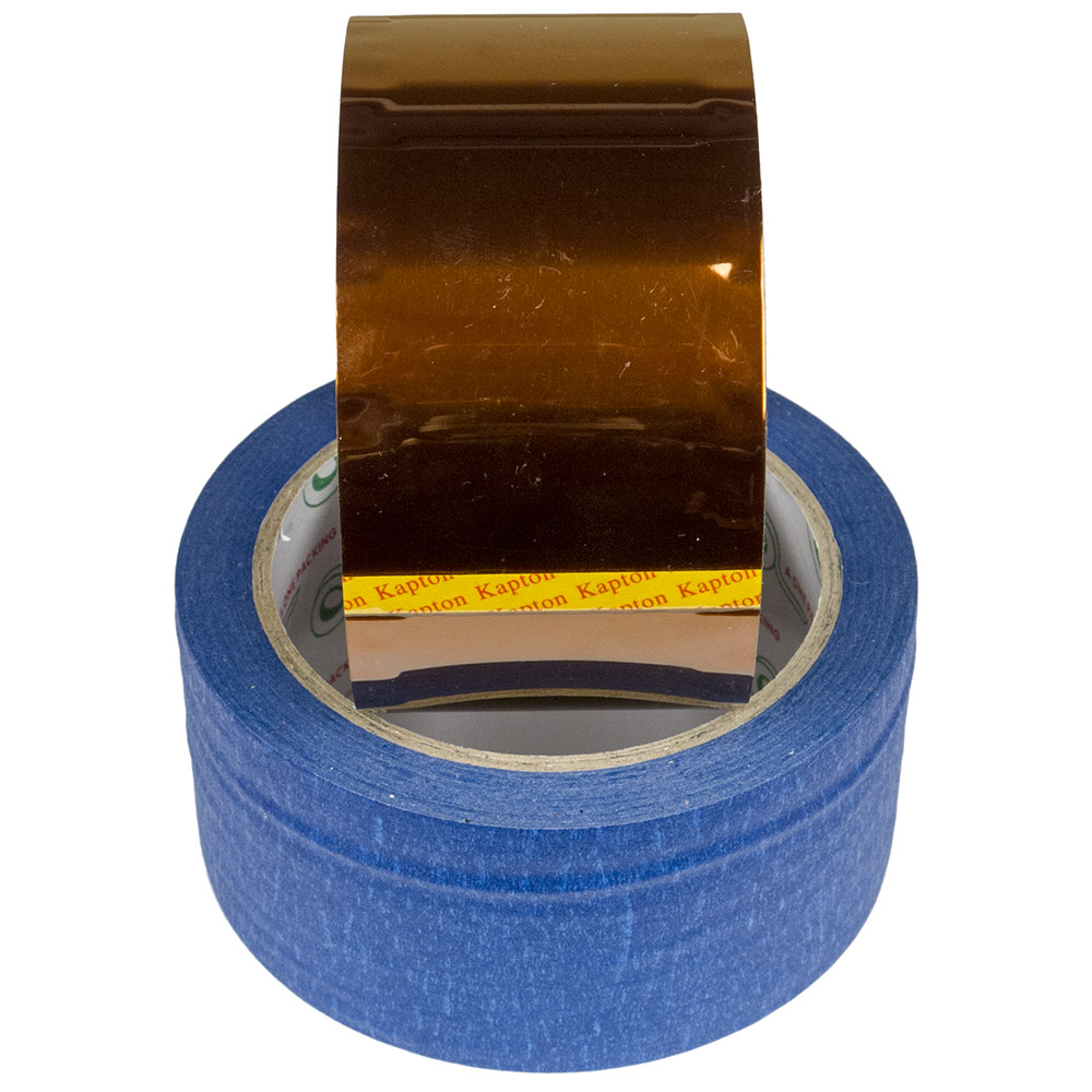 Синий скотч обычно поставляется шириной 25, 48 и 75 мм (48-миллиметровая лента зачастую в прайсах обозначается «50 мм», но это округление) и имеет толщину 45 мкм, у Kapton Tape выбор ширины гораздо более богатый — от 2 до 200 мм, обычная толщина 65 мкм (часто пишут 0,06 мм).