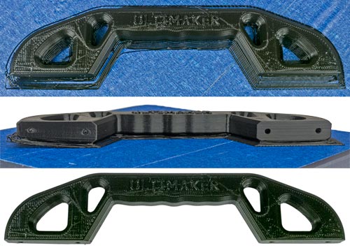 Еще одна модель, STL-файл для которой устанавливается вместе со слайсером: ручка для переноски, также с надписью Ultimaker. Параметры печати не меняли, лишь убрали кайму — соотношение основания к высоте вроде бы достаточное, но вот саму фигурку средствами Cura пришлось уменьшить на 35%, поскольку в оригинальном размере она не помещалась на рабочий стол даже по диагонали. Пластик сменили: тоже PLA, но черного цвета.