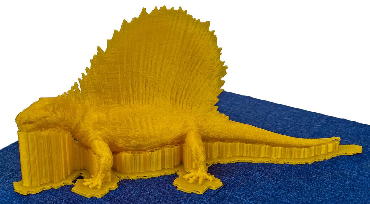 Это существо, подобно рептилиям, передвигалось на четырех конечностях, широко разнесенных по сторонам от туловища. Поэтому у модели всего четыре небольшие точки опоры, значительная ее часть нависает над поверхностью платформы, и печатать нужно с поддержками, что также предусмотрено в слайсере Cura, причем с возможностью индивидуальных настроек (но мы оставили значения по умолчанию).