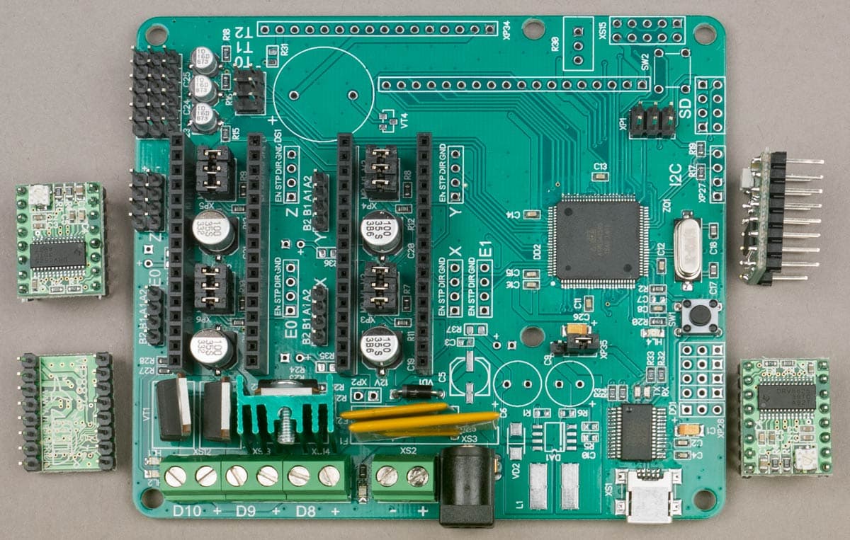 Управление принтером основано на хорошо известной платформе Arduino Mega 2560 с использованием микроконтроллера ATMega2560-16AU. Предлагается основанная на модулях Arduino Mega и RAMPS плата Mastertronics, схема которой доступна.