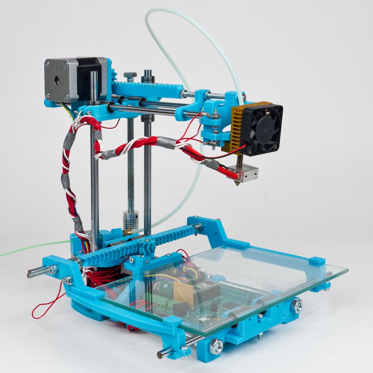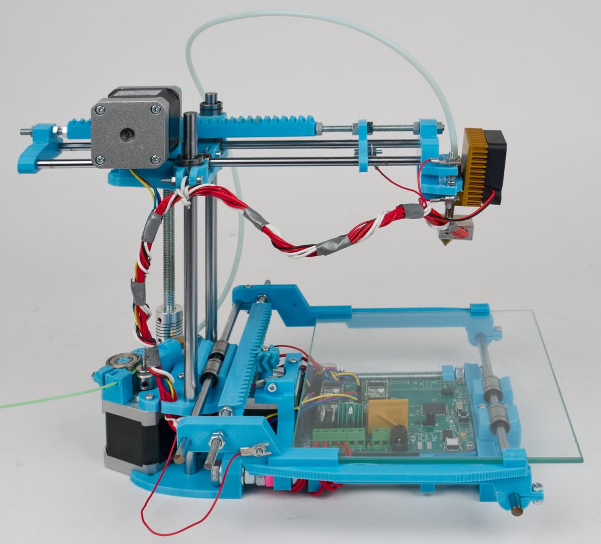 Экструдер и хот-энд в данной конструкции разнесены на довольно большое расстояние. Кроме того, хот-энд во время печати перемещается, поэтому нужно обеспечить «бесперебойную доставку» нити от экструдера в хот-энд, что реализовано с помощью длинной трубки, скорее всего — фторопластовой. Она достаточно пластична, чтобы не мешать перемещениям печатающей головки, но в то же время более жесткая, чем сама нить, а потому не скручивается.