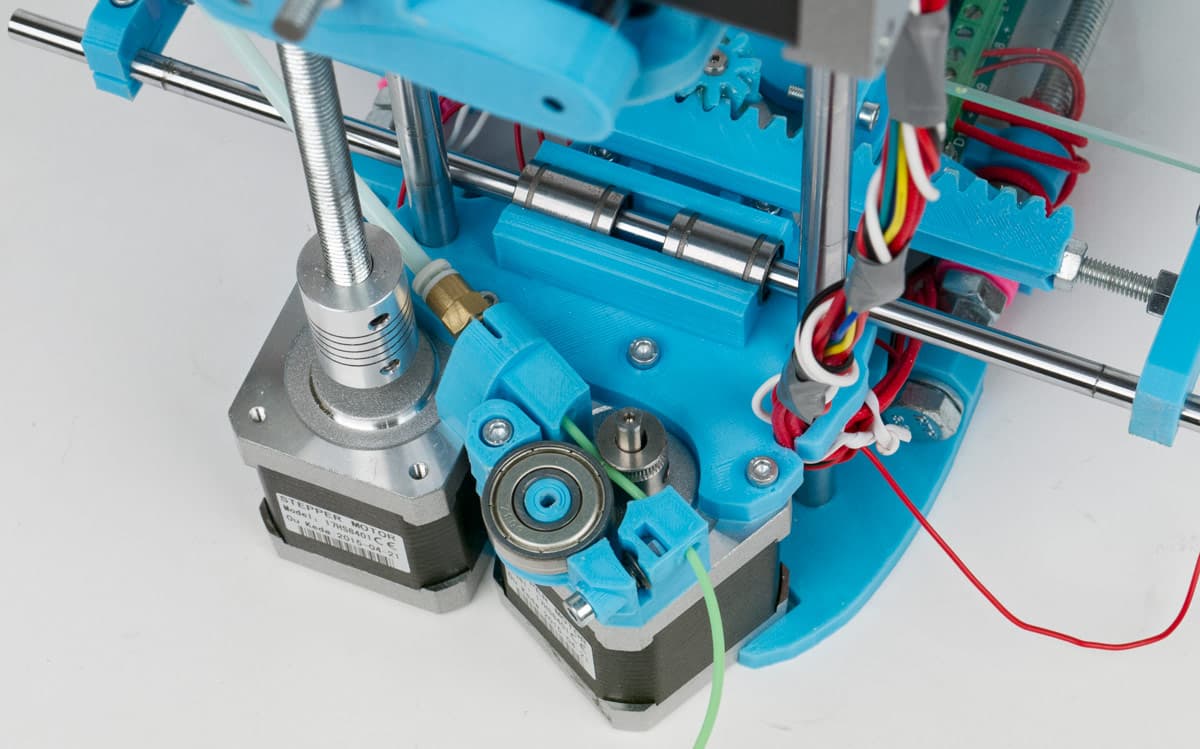В принтере использованы четыре шаговых двигателя 17HS8401 (шаг 1,8°, ток до 1,8 А, крутящий момент 52 Н·см, индуктивность 3,2 мГн, сопротивление 1,8 Ом). Про привод по оси Z мы уже сказали, а для X и Y используются пары «шестерня – зубчатая рейка», выполненные из пластика.