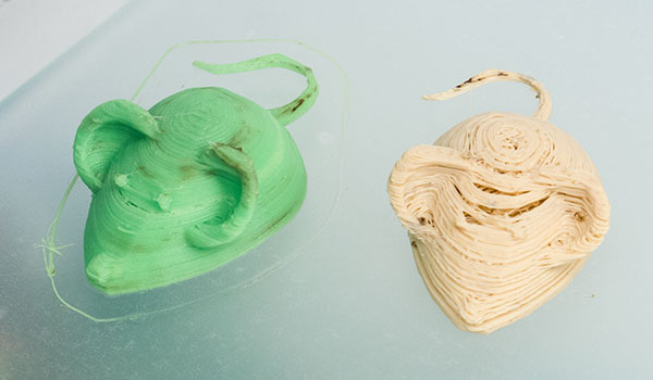 Видите, зеленая зверюшка выглядит гораздо лучше бежевой (которую мы для сравнения положили рядом), хотя и над ней еще можно поработать, подбирая настройки. К тому же вид подпорчен темными пятнами на поверхности — перед печатью надо было как следует очистить сопло от нагара. А если за достаточно короткое время образовался нагар, то есть сомнения в качестве первой нити, бежевой.