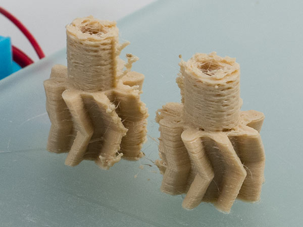 Качество печати с этой нитью вновь выше — для сравнения мы положили рядом шестеренку из бежевого PLA, напечатанную в предыдущем тесте, но с геометрией та же беда: вместо круга овал. Нужна калибровка и настройка режимов печати.