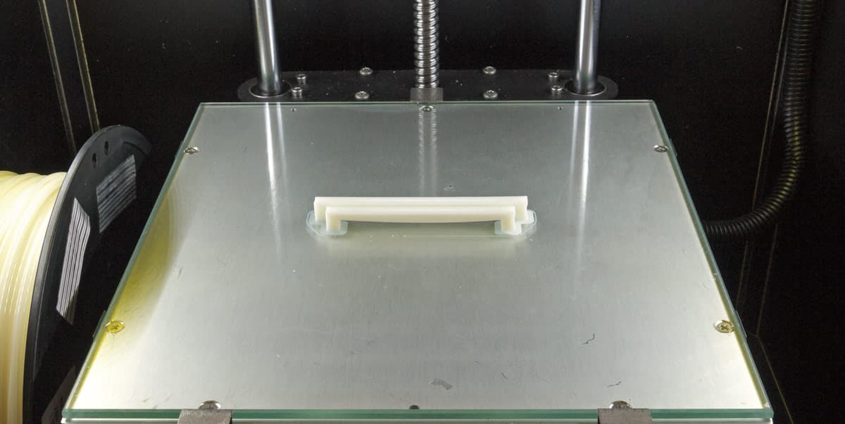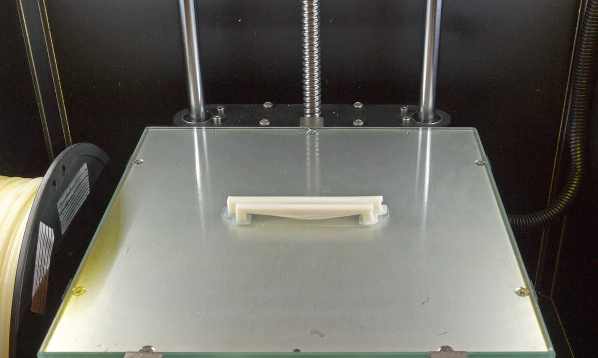 Это модель подходит и для оценки адгезии: площадь соприкосновения основания модели со столом мала, даже с учетом полей, а сама модель большая, печатается долго, и температурные деформации зачастую сказываются — какая-то часть периметра приподнимается. Для PLA это сказалось в меньшей степени: оторвался и на долю миллиметра приподнялся лишь небольшой участок окружности, что сколь-нибудь существенно не сказалось на модели в целом. У ABS термическая деформация сильнее — например, ручка приподнялась заметно (см. фото), да и с адгезией не очень хорошо: всю модель по окончании печати со стола снять можно было без всяких инструментов, легким движением руки.