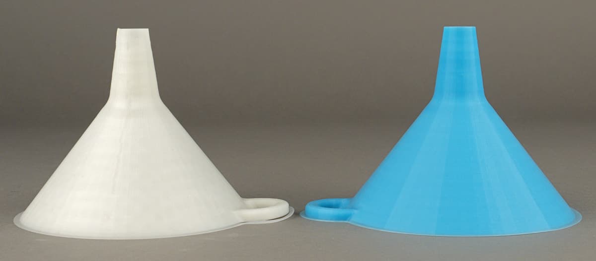 Первый из них — воронка. Ее мы напечатали из обоих типов пластика на скорости 60 мм/с, с заполнением 15%, объем получился 26,1 см³. Для ABS охлаждение выключали, и время получилось 2 часа 15 минут, из PLA с включенным охлаждением печать длилась немного дольше — 2 часа 18 минут.