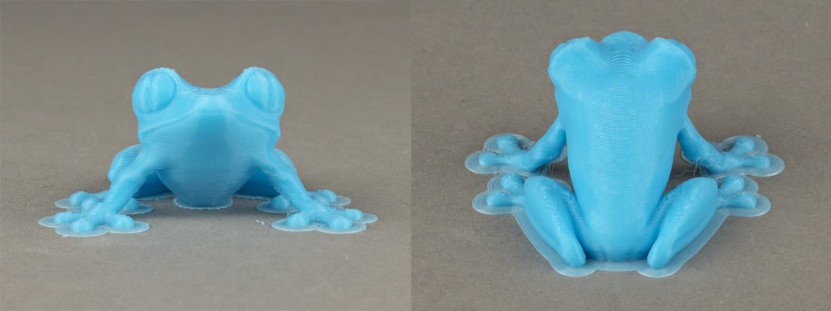 Теперь лягушка — куда же без нее… Печатали из PLA на скорости 45 мм/с с заполнением 33% и включенным охлаждением (47 мин., 6,6 см³), результат получился вполне нормальным, весьма далеким от того безобразия, которое было получено нами при первой попытке печати на принтере Felix 3.0.