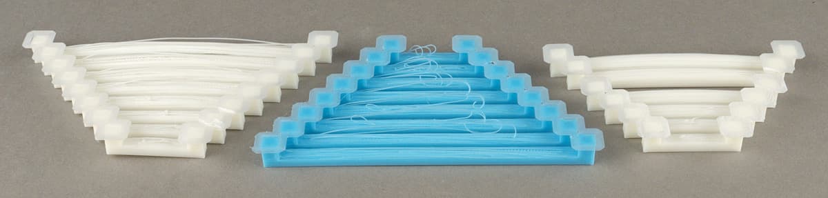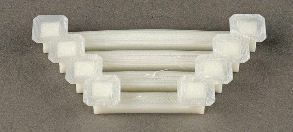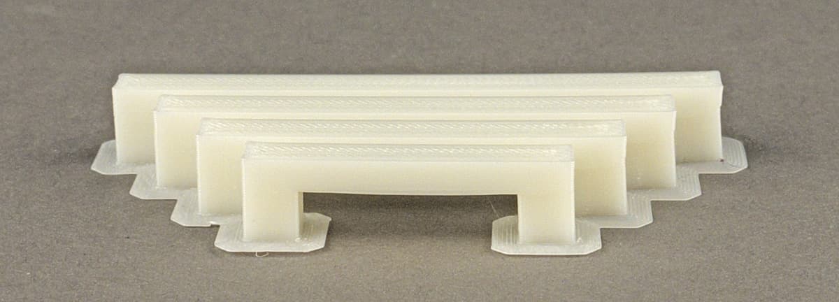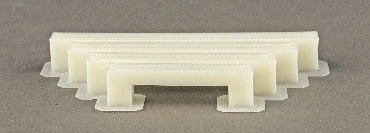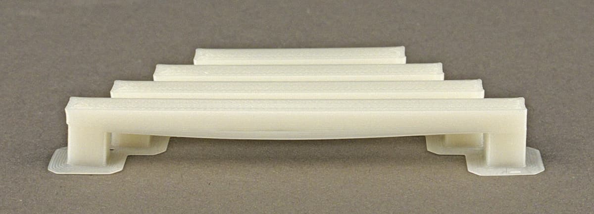 Мы использовали модель с набором из 8 мостов, у которых длина подвешенной горизонтальной части меняется от 20 до 90 мм. Поначалу пробовали доступные настройки печати, включая скорость и коэффициент подачи для натягивания мостов, при неизменных параметрах нити (Picaso ABS и Picaso PLA). Процесс подбора длительный — образец из 8 мостов печатается при разных настройках от 35 до 45 минут, и мы даже поделили его на наборы из 2–4 мостов, чтобы сократить время до 13–15 минут. К тому же всё это связано с заметным расходом пластика: от 2,3 до 9,1 см³.