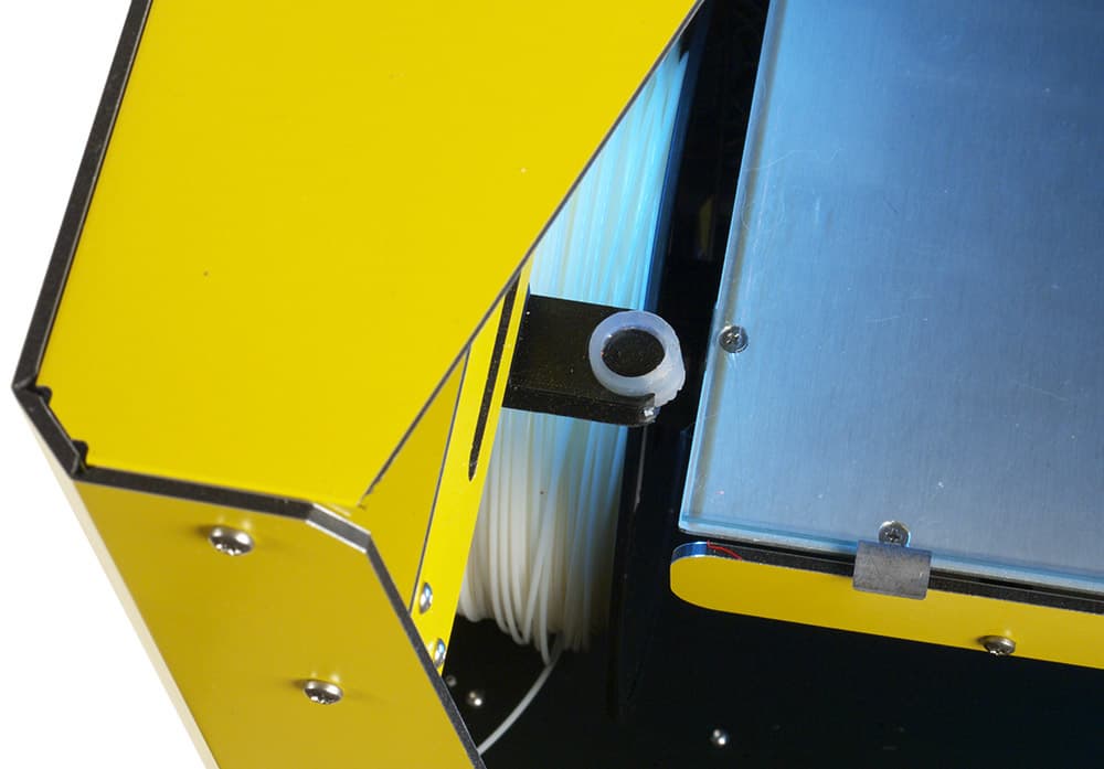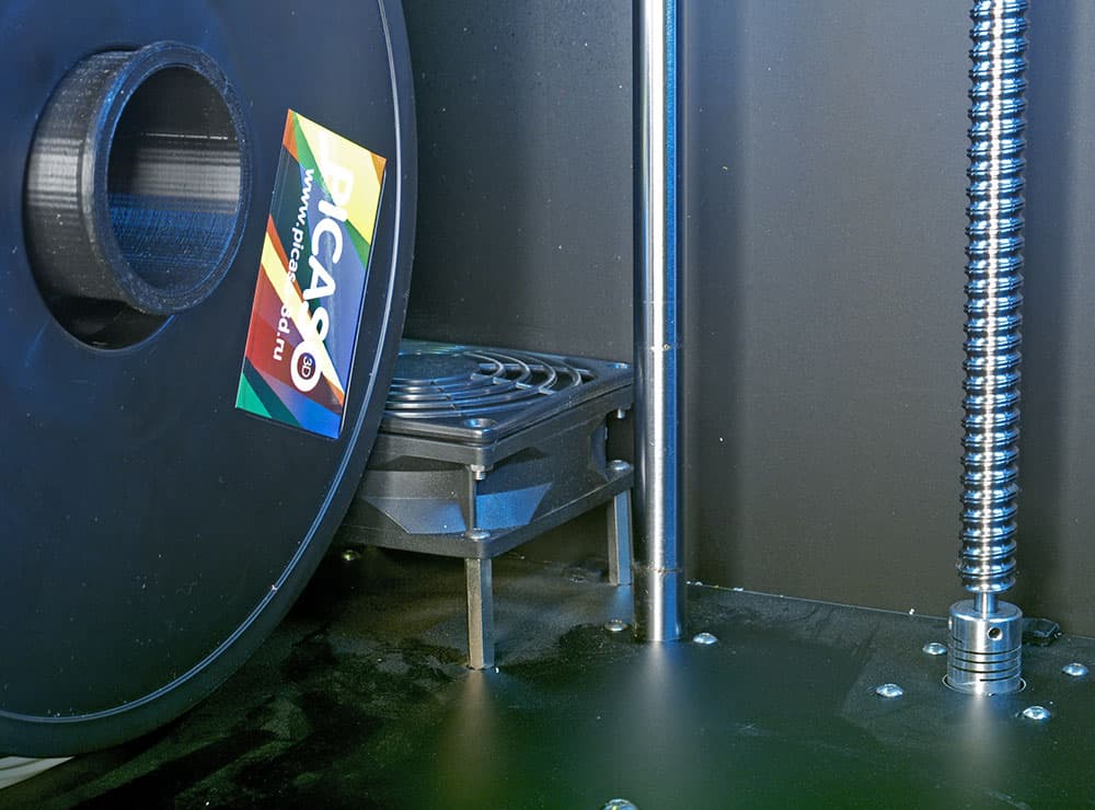 Во внутреннем объеме размещается и катушка с пластиком. На левой боковой стенке изнутри закреплена цилиндрическая ось, на которую и подвешивается катушка, при этом диаметр ее посадочного отверстия не может быть менее 4,8 см. Конечно, если брать нить у производителя принтера, то проблем с установкой катушек быть не должно, однако нам попадались катушки с отверстием в 37 и даже 20 мм — их в Picaso Designer установить не получится.