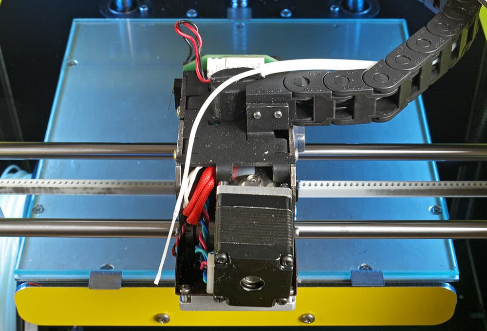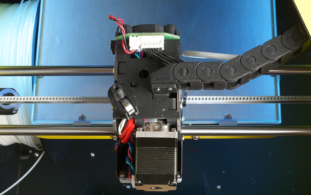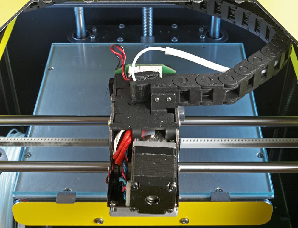 Заправка нити реализована весьма непросто. От середины левого переднего ребра принтера, рядом с которым устанавливается катушка, изнутри до головки проложена трубка (вероятно, фторопластовая), которая поднимается вверх, в гибком кабель-канале проходит вдоль левого верхнего ребра, и затем вместе с кабель-каналом, образующим петлю для обеспечения движения головки, подходит к экструдеру. Нить выходит из трубки горизонтально, и потом с очень небольшим радиусом изгиба вертикально входит в экструдер. Общая длина трубки весьма приличная — целых 80 сантиметров.