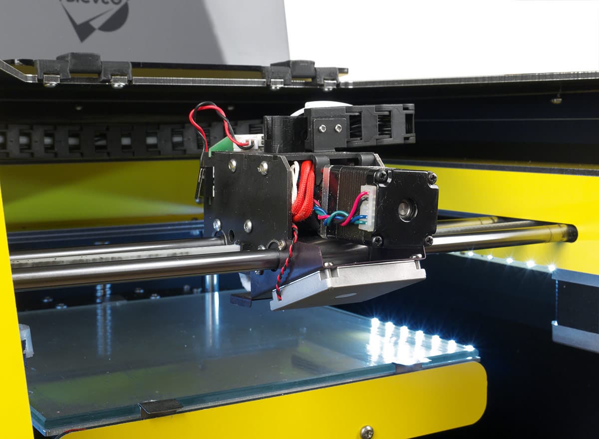 Здесь разница с «принтбоксом» также очень существенная: для всех трех осей использованы не линейные, а цилиндрические направляющие — в общем случае считается, что они обеспечивают меньшую точность печати. Хотя бы потому, что крепятся всего в двух точках, на концах, а линейные могут иметь множество точек крепления, как в PrintBox3D One.