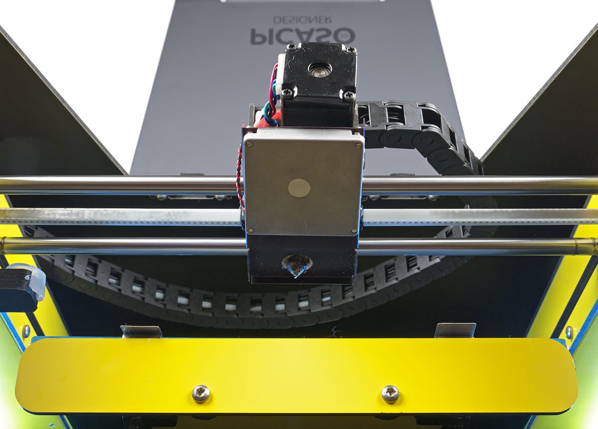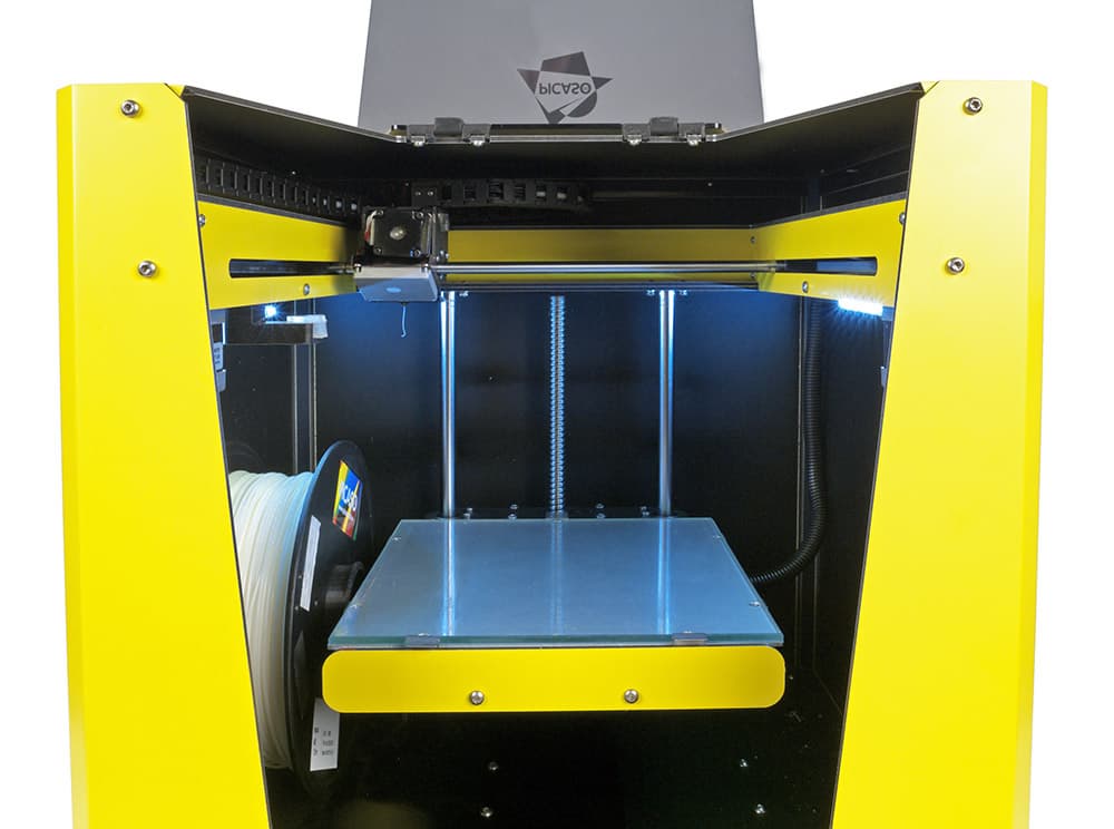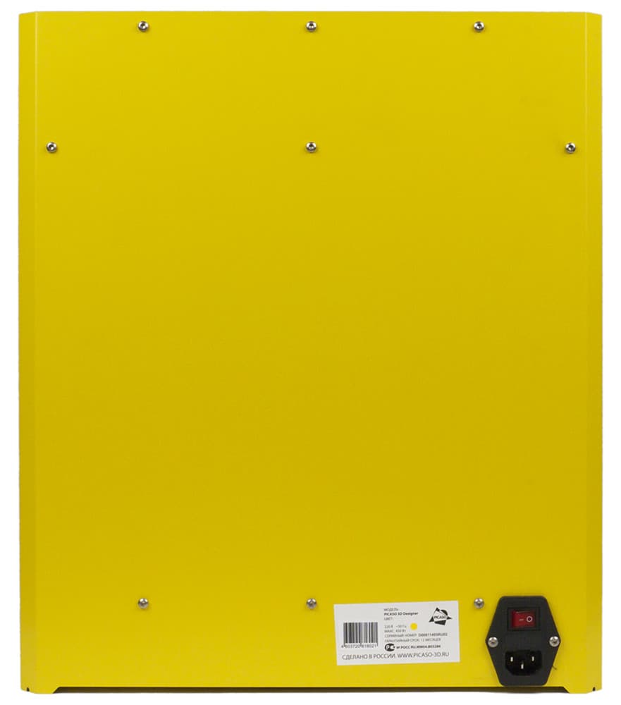 Столь мощной пространственной рамы, какую мы видели в PrintBox3D One, у Picaso 3D Designer нет. Если обратиться к автомобильной терминологии, то у «принтбокса» рамная конструкция, а у «пикасо дизайнера» несущий кузов: его конструктивной основой является короб из листов того самого композитного материала, образующих внешние стенки принтера. Причем снаружи они окрашены, в настоящее время доступны пять цветов — молочно-белый, черный, серый, желтый, красный.