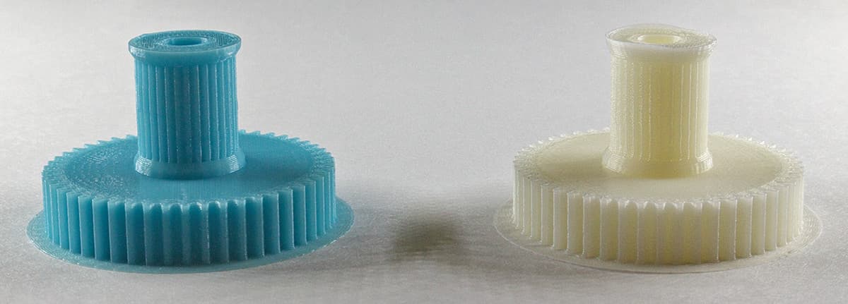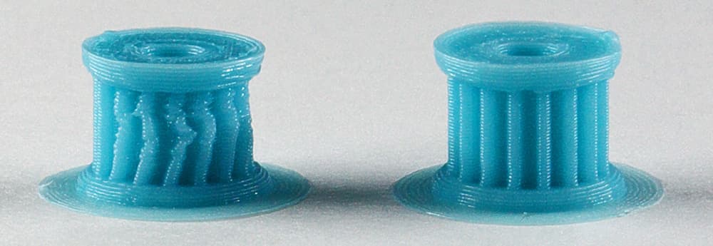 Результат: без охлаждения шестеренки из обоих материалов получались оплывшими с одного бока, а вертикальные зубчики были сильно искривленными, причем в случае с PLA искажения заметнее. С охлаждением шестеренка из ABS напечаталась хорошо, а из PLA на «четыре с минусом» — верхняя плоскость получилась немного неровной.