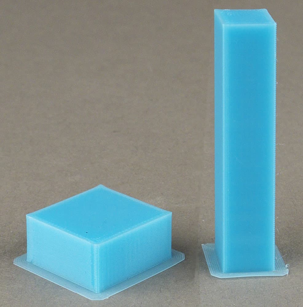 Образец с тонкими стенками (в один слой, 0,4 см³ нити) мы печатали из PLA трижды: с включенным охлаждением на скоростях минимальной 15 мм/с (время 8 минут) и максимальной 80 мм/с (5 минут) — результат одинаково хороший. Но при отключенном охлаждении на скорости 80 мм/с качество заметно упало: в стенках появились щели. Отметим: время при этом значительно уменьшилось — до 2 минут; дело в том, что под охлаждением слайсеры подразумевают не только и не столько работу вентилятора, обдувающего слои (его в принтере может и не быть), но еще и замедление печати наиболее ответственных слоев, прежде всего тонких стенок, чтобы они успевали застыть. В данной модели все стенки тонкие, поэтому разница во времени получилась столь заметной.