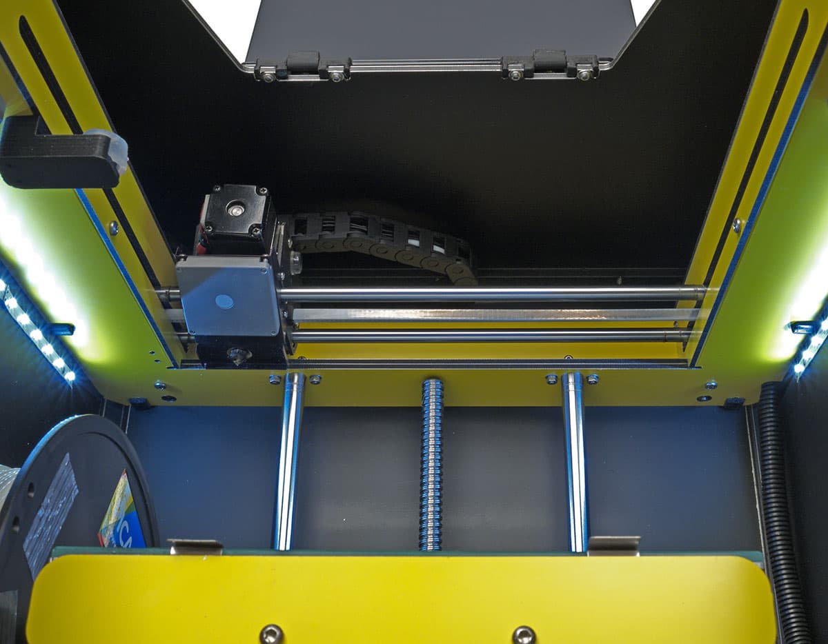 Еще немного о закрытом корпусе: конечно, пыли в него будет попадать значительно меньше. Зато удалить мелкий мусор вроде кусочков выдавленной из сопла и застывшей нити, которых во время работы образуется немало, гораздо сложнее — просто смахнуть их не получится, нужен пылесос.