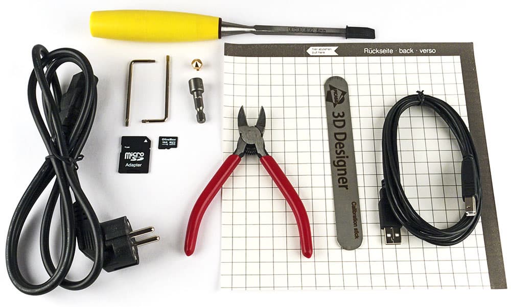 - набор инструментов: небольшие кусачки-бокорезы (полезная штука), стамеска с лезвием шириной 6 мм (с ее помощью предлагается отделять напечатанные модели от платформы; на наш взгляд, лопаточка-мастихин из комплекта PrintBox3D для этого гораздо удобнее, да и для удаления поддержек стамеска не всегда годится — тут нужен целый набор приспособлений), а также два Г-образных ключа с наконечниками Torx для регулировок,