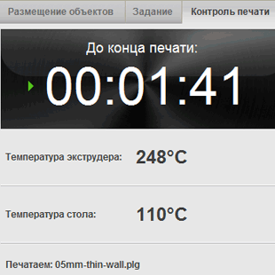 Если печать ведется с компьютера, то в программе Polygon отображается время до конца печати, что очень удобно. Естественно, на компьютере должен быть отключен переход в энергосберегающий режим — сон, гибернацию, исключая разве что гашение экрана, но при выходе из него у нас порой пропадала индикация времени до конца печати, равно как и показания температур, но тут скорее виновата не программа, а наш не самый мощный тестовый компьютер.