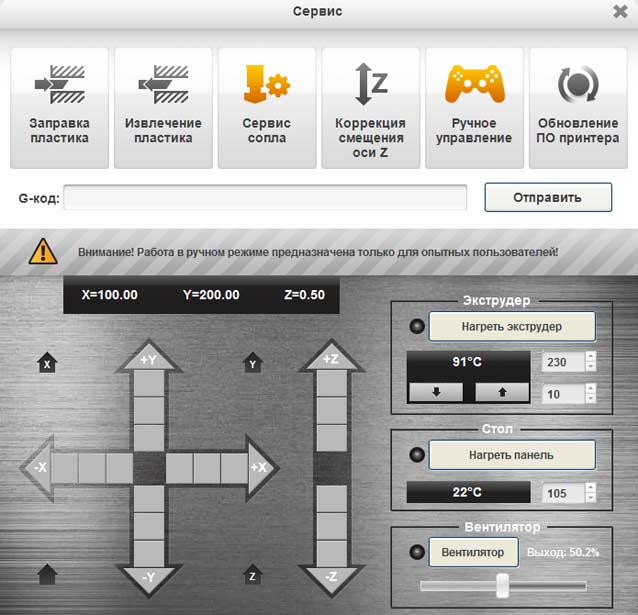 По каким-то непонятным причинам, в ручном режиме управления из окна «Сервис» Polygona выполнение команд на нагрев экструдера и стола порой прерывается, и температуры, не достигнув заданных значений, начинают понижаться. Это происходит регулярно и порядком раздражает, если хочется перед началом печати заблаговременно прогреть стол и хот-энд. И уж точно нагрев прекращается, если закрыть окно ручного управления, чтобы вернуться в основной интерфейс программы, например, для запуска печати.