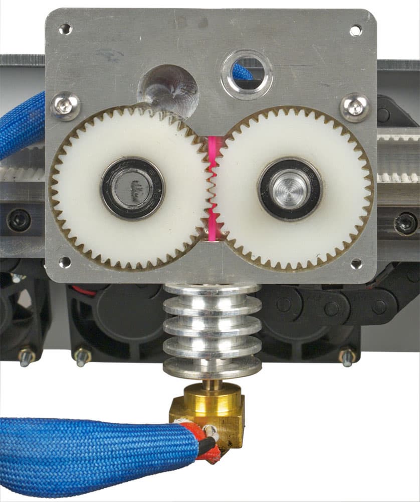 Шестерни посажены на валы с помощью подшипников и приводятся в действие закрепленным на корпусе экструдера шаговым двигателем того же типа, что и в приводах. Для прохождения нити в зубьях шестеренок сделаны проточки, «обнимающие» нить по периметру. В результате усилие подачи получается очень мощным, позволяющим легко справляться с перехлестом нити на катушке, однако сама нить не деформируется зубьями шестеренок.