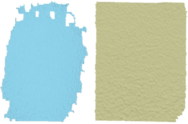Если сканер в процессе транспортировки подвергался толчкам и тряске, работу можно начать с проверки: достаточно под прямым углом направить сканер на светлую ровную однотонную поверхность (стену, пол, столешницу) с расстояния, находящегося внутри рабочего диапазона, причем не в ближней или дальней зоне — для Eva это 60–80 см, и в режиме предпросмотра Artec Studio оценить геометрию наблюдаемого в окне 3D-вида прямоугольника. Конечно, идеальным он вряд ли получится, но если его форма будет примерно такой, как на правом скриншоте, то всё в порядке, а наличие искажений, имеющихся на левом скриншоте, говорит о необходимости коррекции.