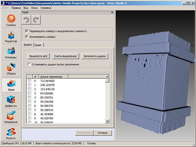 Можно было пойти и другим путем — воспользоваться панелью «Края», которая работает не только с краями, но и с дырками. Инструмент очень удобный: в каждой из вкладок — «Дырки» и «Края» — отображается список обнаруженных дефектов, формируемый автоматически сразу после запуска данной панели. На модели, полученной после точной склейки, ничего обнаружено не было, и мы воспользовались результатом быстрой склейки, где дефектов было превеликое множество, в них просто можно было потеряться.