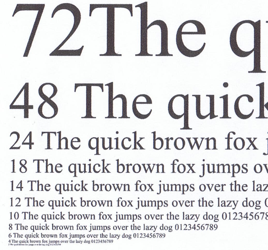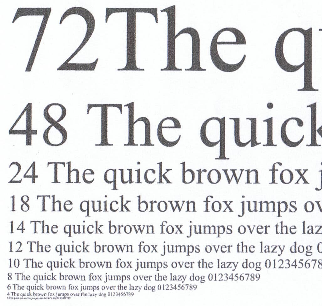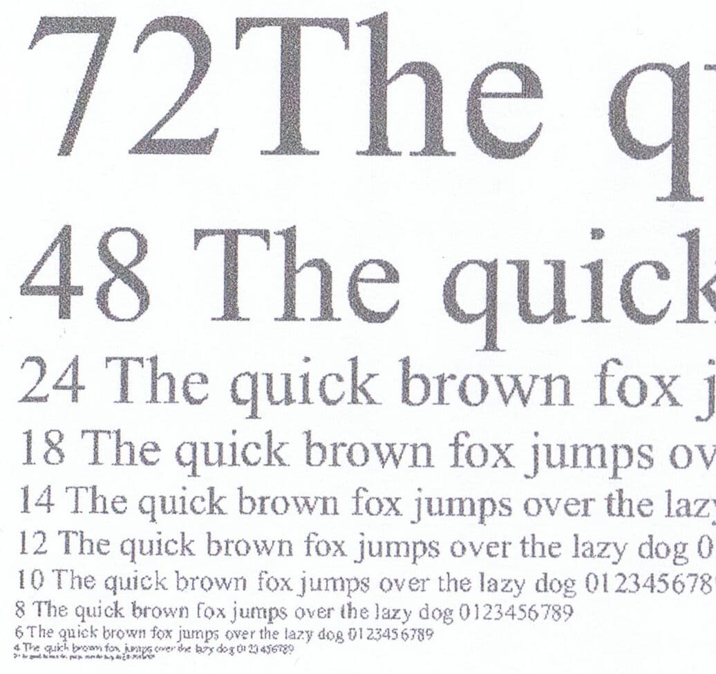Впрочем, медлительность устройства положительно сказалась на качестве печати. Если в режимах быстрой и «нормальной быстрой» печати текст оставался очень «рыхлым» и в качестве приличного документа не мог быть воспринят ни при каких обстоятельствах, то уже начиная с нормального режима, тексты приобретали достойные очертания, а выбор хорошего качества и вовсе позволял создавать отпечатки, близкие к лазерной четкости. Граница различимого кегля также зависит от качества: для быстрой печати читаемым будет шрифт 6 кегля, а при хорошем качестве этот показатель улучшается до 2 кегля.