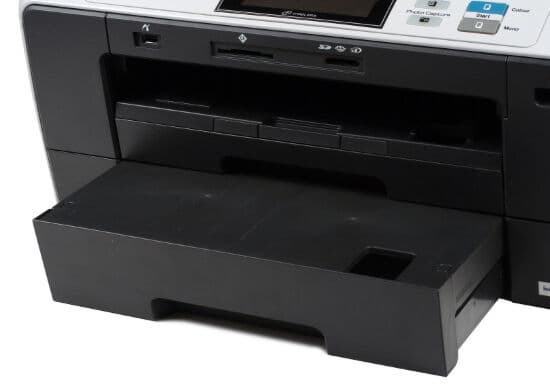 Устройство имеет два штатных лотка для подачи бумаги: на 150 и 250 листов. Каждый из них может раздвигаться, чтобы уместить листы формата А3. Для удобства обновления запасов бумаги, лотки полностью и без каких-либо преград выдвигаются из своих гнезд.