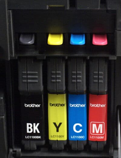 Отсек для замены картриджей расположен спереди за откидной крышкой. Приблизительный ресурс картриджей черного цвета (LC-1100BK или LC-1100HY-BK) составляет около 450 или 900 страниц А4. Для цветных картриджей (LC-1100C/M/Y или LC-1100HY-C/M/Y) эта цифра составит 325 или 750 страниц. Нижняя планка цен на картриджи расположена в диапазоне от 370 до 930 рублей (в зависимости от ресурса). Не лишним здесь будет отметить, что при печати в хорошем или фотографическом качестве, картриджи начинают в буквальном смысле испаряться на глазах.