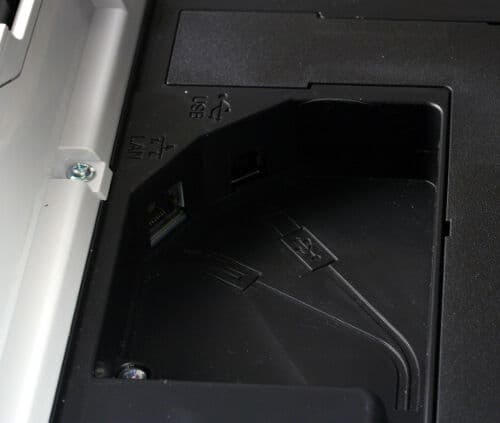 Подключение принтера производится «по-взрослому»: кабель проводится внутри принтера, под крышкой, и фиксируется в специальном желобке. При этом силовой кабель подключается с противоположной стороны и торчит из бока устройства, мешая придвинуть его к стене вплотную.