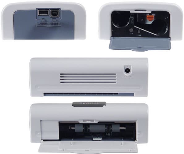 Выглядит принтер очень симпатично и, что радует, совсем не дешево. Ничего лишнего, все только самое необходимое. Слева интерфейсные разъемы USB и PictBridge, прикрытые аккуратной резиновой заглушкой. Справа место для установки кассеты-картриджа, также спрятанное под крышку, исполняющую роль декоративной боковины. Разъем питания расположен на обратной стороне принтера, здесь же находятся вентиляционные отверстия и щель для выхода бумаги в процессе печати. Верхняя часть принтера имеет небольшое окно, через которое хорошо виден тип используемого картриджа. Окно подсвечивается изнутри, либо синим, либо красным светом. Думаю, понятно, что красная подсветка означает «Внимание», сигнализируя об окончании бумаги, замене картриджа или заторе. Если проблем нет, то мы наблюдаем только приятное синее свечение.